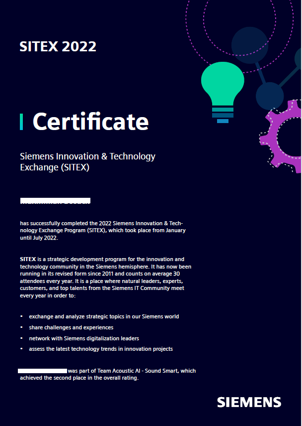 On behalf of a sub-department within IT, I was tasked with creating certificates for participants of the SITEX event. The corporate design I developed for the event series was taken into account.
